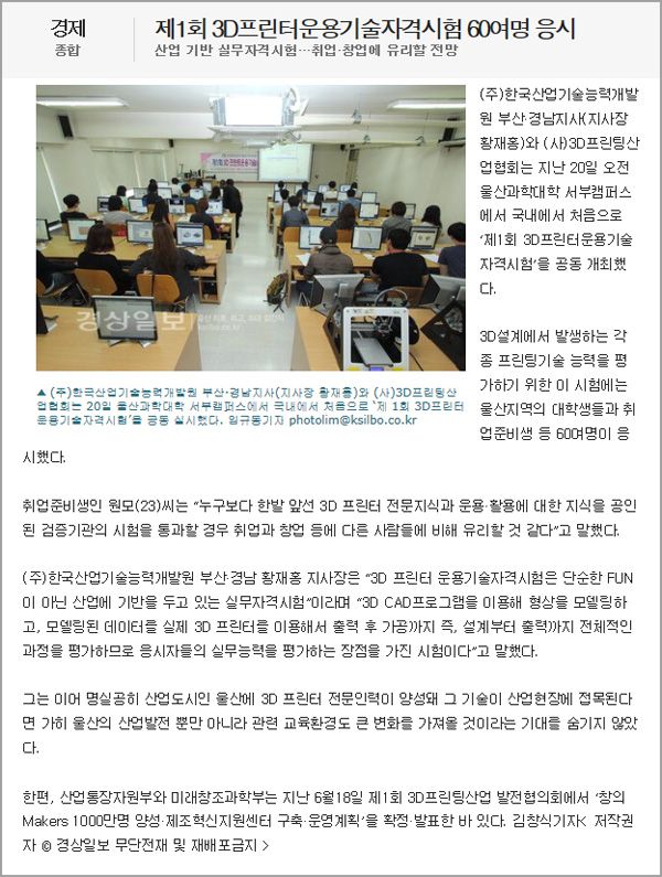 2014. 09. 20(토) 울산과학대학 서부캠퍼스에서 국내 처음으로 '제 1회 3D프린터운용기술자격시험'을