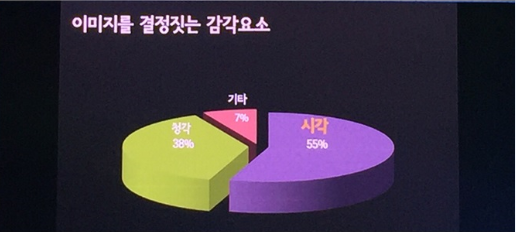 의상 | 밝은 옷 자연스러움 편안함 친밀감 | 블라우스 셔링 여성미 강조 남자의 경우 셔츠 컬러는 ‘오프 화이트’ 추천 → 컵에다 우유를 따른 컬러 신뢰감을 주는 넥타이 패턴? 스트라이프 (금융권에서 많이 사용, 특히 노란색은 금을 상징 → 시중은행 로고는 모두 노란색) | 남자의 경우 타이는 원색컬러를 씀 (레드는 CEO를 상징하므로 피할 것) |